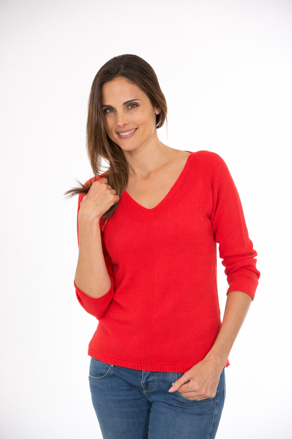 Notre mannequin mesure 1m77 et fait une taille 38, elle porte le pull Cœur en Taille 1 (ajusté avec une épingle)